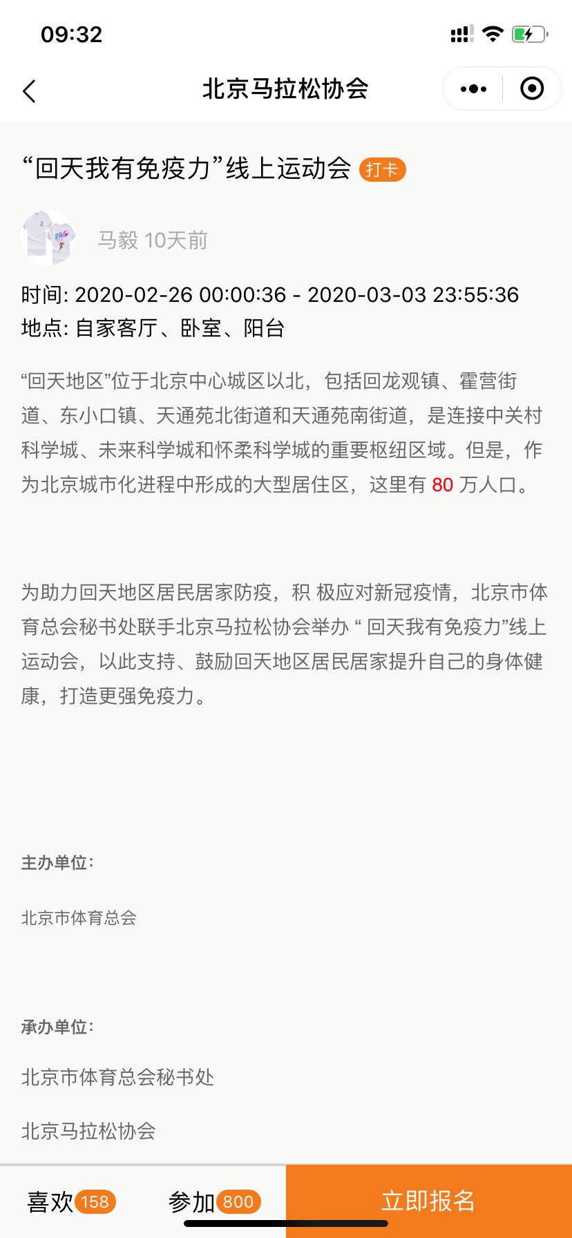 在赛事组织方面,针对疫情期间活动场地的局限,北京马拉松协会创新赛事组织形式,利用互联网+赛事的模式,拓宽参与人群,先后已承办2场网络赛事。其中,“健康空间·居家战疫”全民健身线上挑战赛,活动共收取健身视频400余条,公众号、微信群、朋友圈总传播量达50万人次。“回天我有免疫力”线上运动会,面向回天地区居民鼓励运动,提升免疫力,共计有800位运动爱好者参加,打卡次数达4500余次,共计22个中小微企业参与其中。