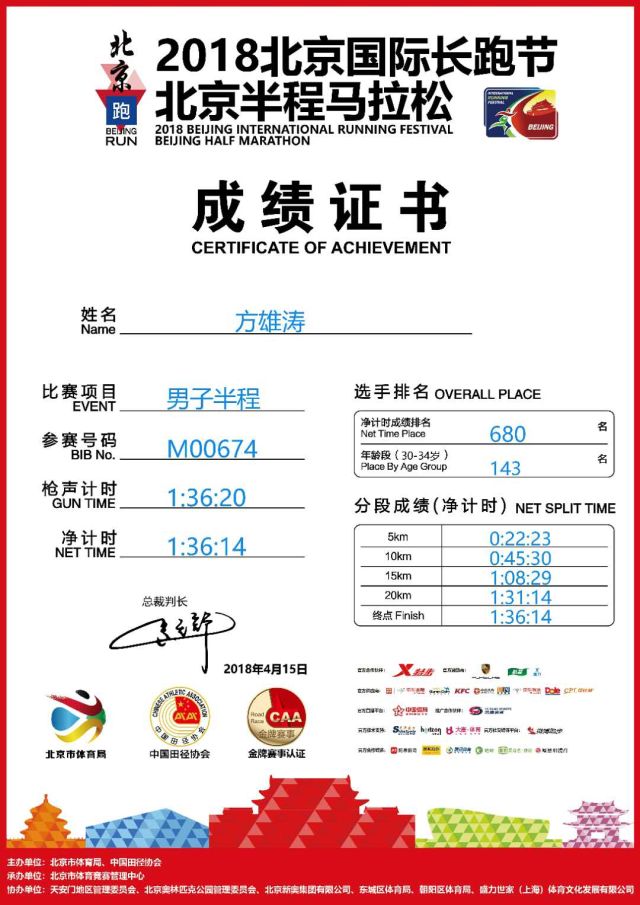“ 2018年4月15日,圈内称为马拉松春运的日子,我参加了北京长跑节,成绩1:36:15,相比一年前,成绩提升了整30分钟。”