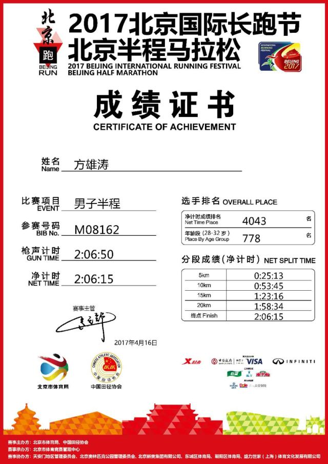 前10公里花了50+分钟,看到里程牌,我心想,so easy啊。后面还有一半,怎么着,就算用走,每公里11分钟,我也能完赛啊。就这样我慢慢跑,慢慢掉速,到第17公里,腿开始抽筋,自己默默的走到赛道边拉伸。腿越来越疼,找赛道医护喷云南白药。最终……当然完赛了,哈哈。而且成绩还出乎我的意料:2:06:15,我简直不敢相信这成绩是自己创造的,配速破6分/公里。